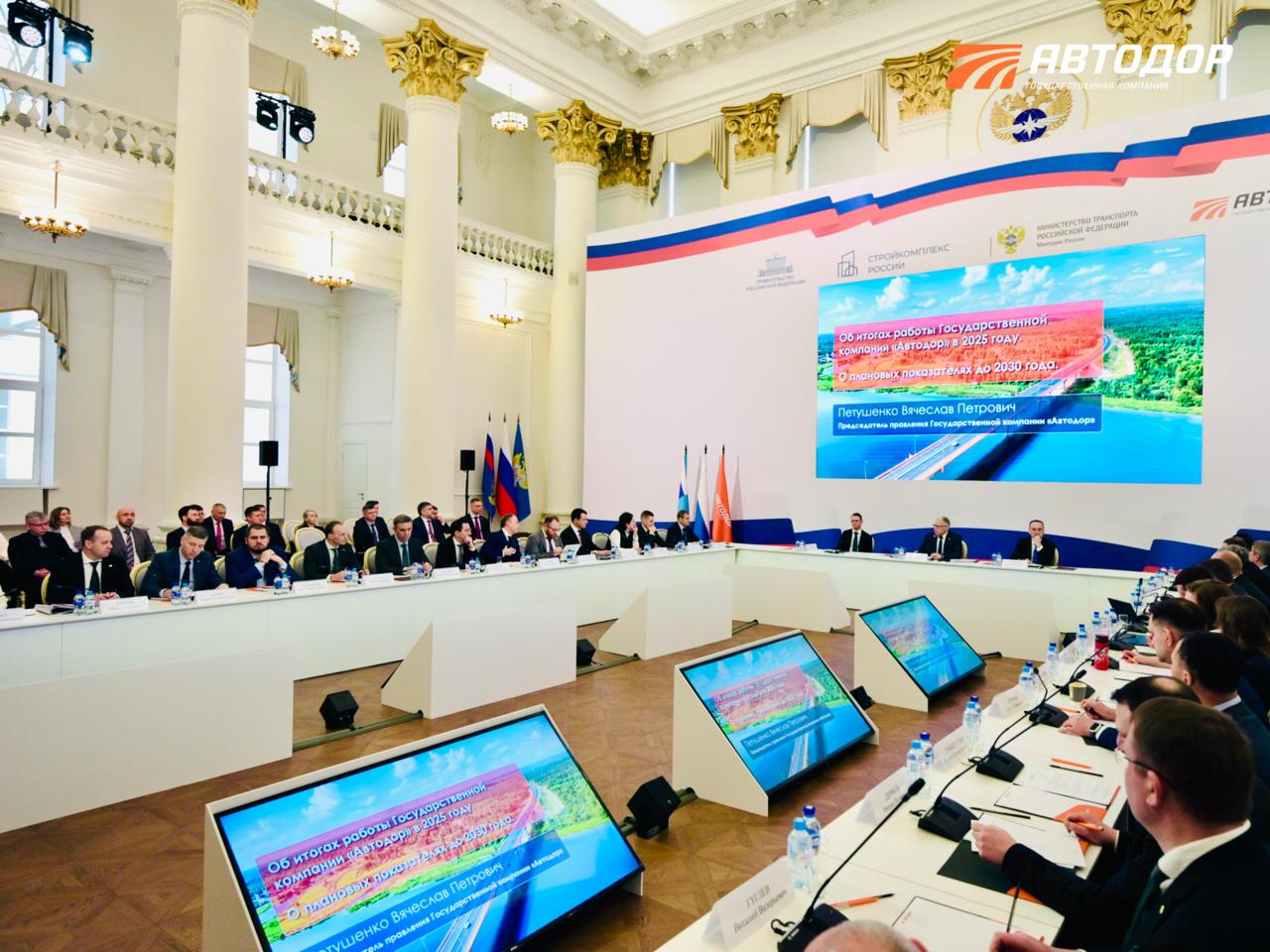 С приветственным словом выступил глава Госкомпании «Автодор» Вячеслав Петушенко. Он подвел итоги исполнения Программы деятельности Госкомпании и дочерних обществ в 2025 году.